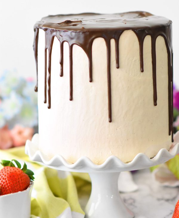 - Decoreer tot slot de taart met een chocolade drip. De chocolade drip maak je door 50 ml slagroom en 100 gram pure chocolade te smelten in een pannetje of au bain Marie. Laat de chocolade wat afkoelen en test van te voren of de drip qua dikte goed is. Ik test het altijd even door het te ‘druppelen’ op een glas die recht naar beneden loopt. Uiteraard kun je de taart nog versieren met bijvoorbeeld bloemen, fruit, strooisels, chocolade, koekjes, snoep etc.